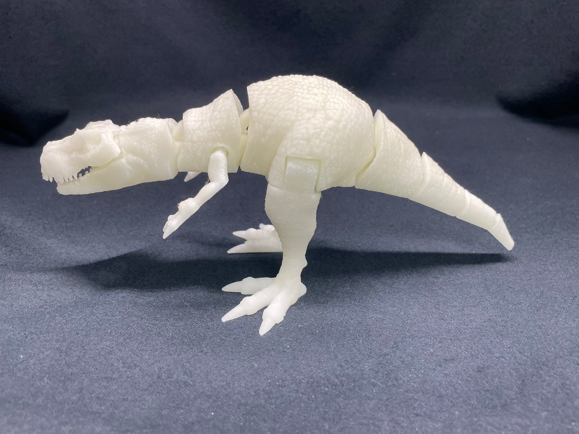 These are 3D printed in one of several filaments, Glow in the Dark is available for the Dino's as well as some dual color Silk filaments.