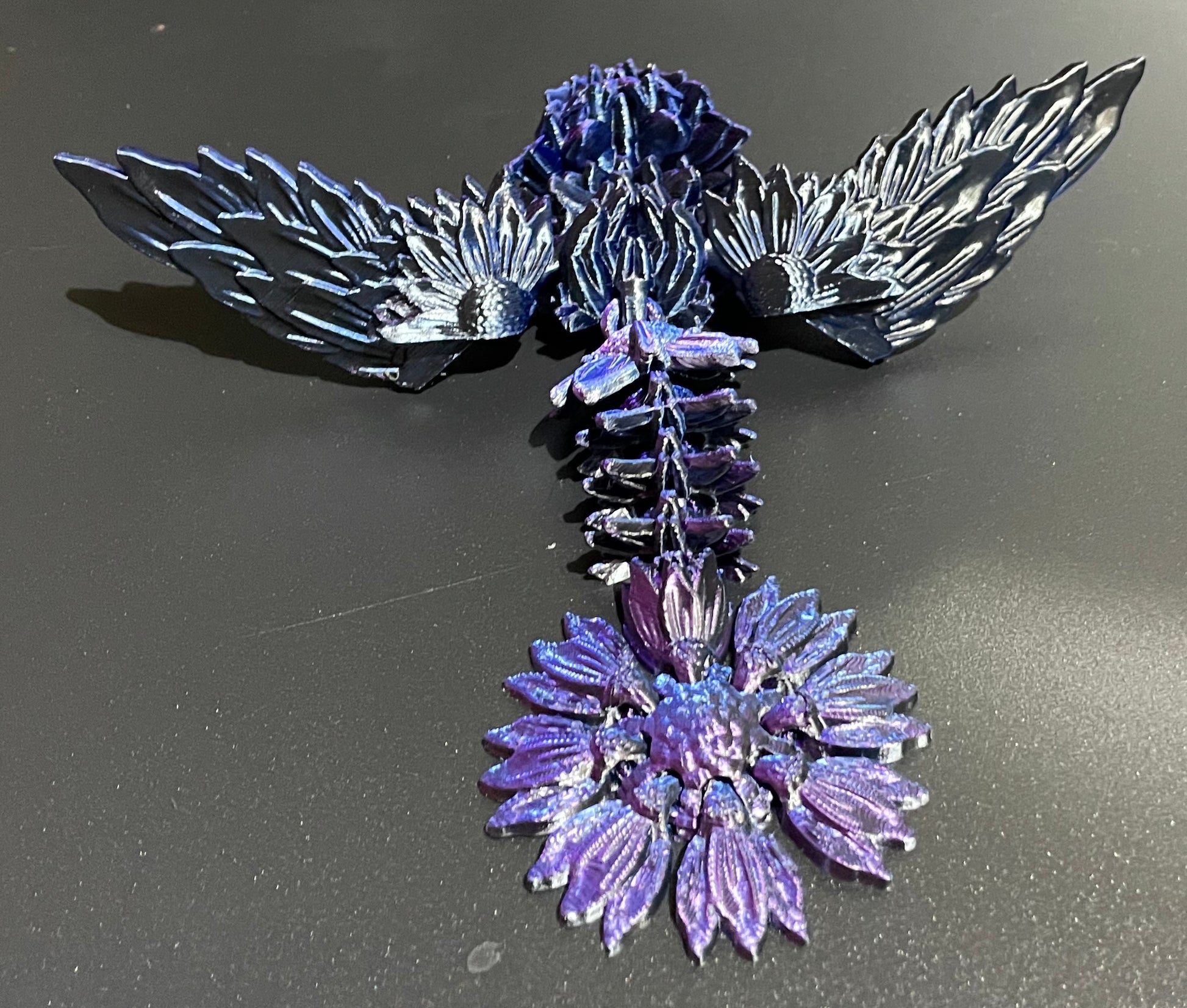 The Phoenix tadling with Wings is a bit over 5" long. This one is printed in Blue, Black, Purple.